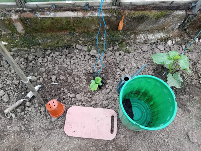Something else that’s decided to “come on” after threatening to die off for a couple of weeks, is the last of the cornichons which has sprung into life following another timely intervention from the B&M department (we’ll make a rough gardener out of him yet) . He suggested standing some of the more lacklustre pots in a very mild solution of seaweed concentrate and it’s worked, not only on the capsicums and the cornichon, but also on some peas and beans (more of which next time). Much of the problem (we think) lies with the quality of the compost we’ve been using, but the seaweed seems to give it a bit of a bounce. Any road up, I now have a kneeling pad and a carefully positioned, sturdy stick to help me stand up. “Macho Man” days are well and truly over!