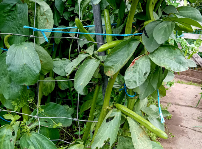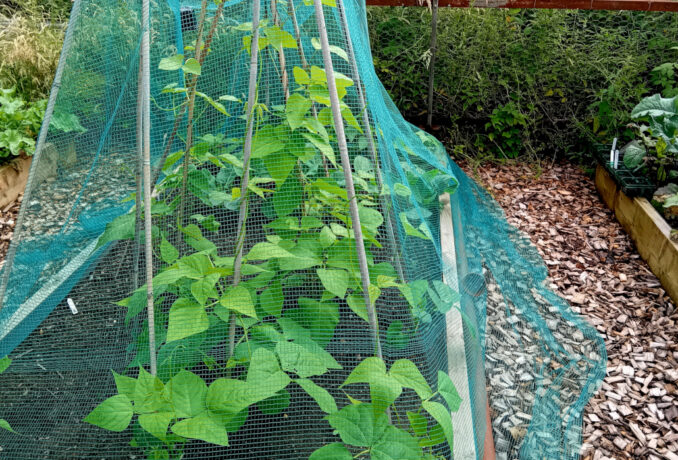 I bought the netting primarily to protect what was going to be a full patch of brassica, but in the end I only planted a single row of a “sweetheart” type cabbage so found myself with space to finally get some runners and other climbing beans going. It’s been a slow start, but they’re coming along nicely now. Sadly neither cabbage or actual beans will be in evidence for the village show (watch this space, show edition in a fortnight, I’ll bet you can hardly contain your excitement) but I’m hopeful of plenty of both for the freezer, come September time.