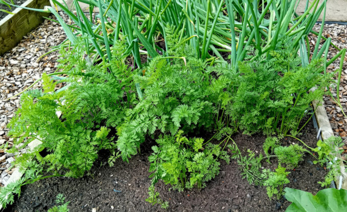 For all the ups and downs there have been, and there have been more than enough downs, I’m very hopeful for the carrot patch. I probably mentioned that growing carrots in close proximity to onions is an old gardening trick (I found out about it earlier this year). It seems to have worked, all the onions, more or less, are doing really well and the carrots, which I’ve yet to disturb, appear mostly to be doing very well. The Chantenay have been slow to germinate, as have the parsnips (neither in the picture), but the ordinary carrots and the ‘mixed’ variety all seem very healthy. I’m thinking now I should have maybe thinned them out, but this is a first for me. Looking forward to seeing the results.