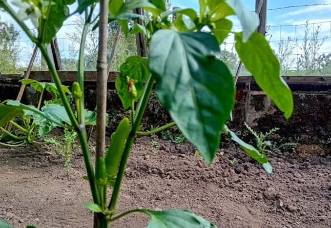 The lone courgette (see last edition) is now in the ground and seems to be thriving, although it isn’t of a size quite yet to allow it to be ‘trained’ onto the frame. The majority of the earlier planted capsicums are now starting to flower, with a couple of this particular variety producing fruit. Not having the foggiest idea of the type, the first taste (something of a ritual now) may well be quite interesting. Any road up, there should be plenty for both chilli jam and the newly developed (they’ve gone down quite well) pepper relishes. I suppose there’ll be a glut come the end of the summer, but that, as they say, is (greenhouse) life.