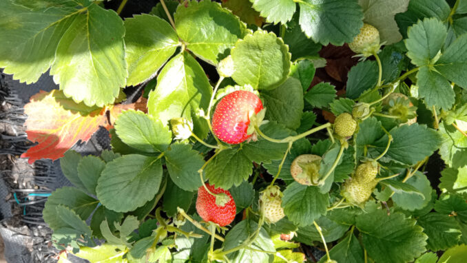 I may have mentioned (I could check back, but I can’t be bothered) that we had an early harvest of small, not very tasty and far from sweet strawberries, following the early warm spell back in April and May. The same plants also put out a profusion of “runners”, far more than I can ever remember in the past. Me being me, I did begin to despair of getting a decent fruit or two, but I needn’t have been concerned. I’ve been picking between ten and fifteen lovely ripe fruits on an almost daily basis for a couple of weeks now, and they just keep coming! I’ve taken sixty potential new plants off the runners and I’m storing them hydroponically (in a tray of water) as replacements for the plants that aren’t doing much of owt. Happy days.