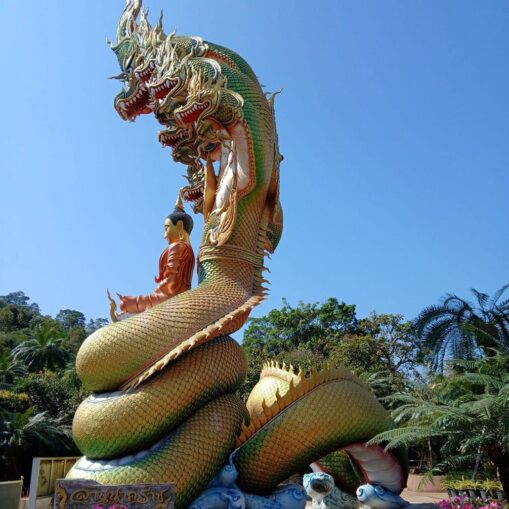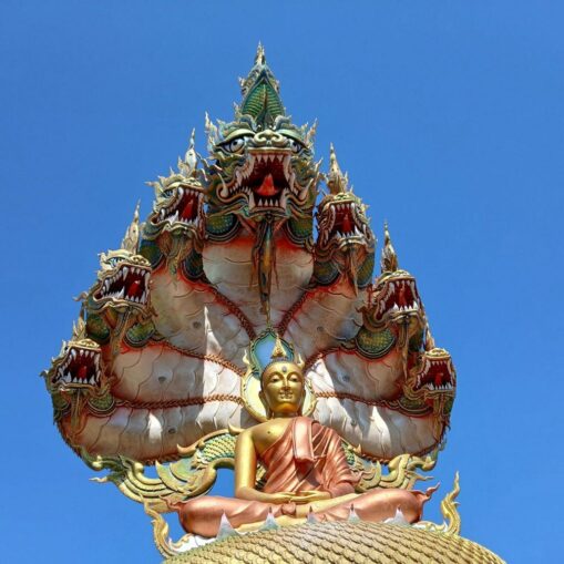 The centre piece of the temple is a jaw-dropping very colourful 60ft tall statue of Buddha depicted being protected by a seven headed forest serpent called a ‘Naga’