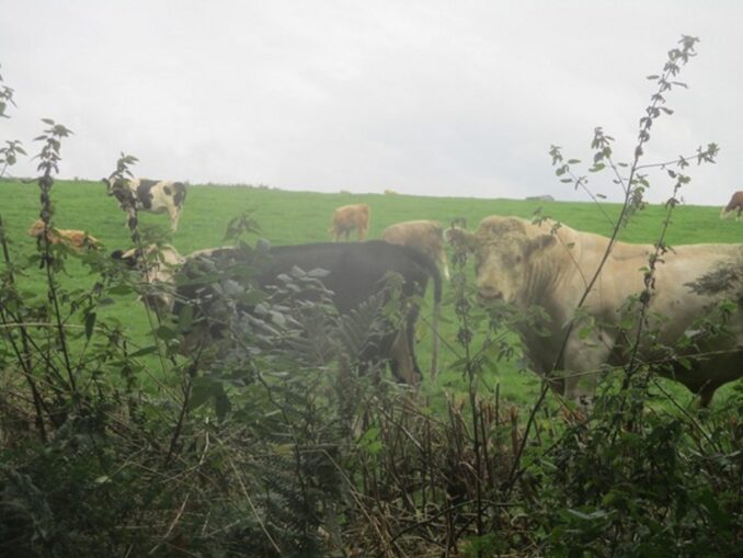 There really isn’t much else to say about this ride. The going was easier than I’d expected, along quiet lanes that meandered along through hamlets and villages of Devonian granite capped with slate roofs, with delightful names like Chillaton, Quither, Tinhay, Broadwoodwidger and Whimble. The terrain was rolling rather than hilly, like a rumpled quilt, patterned with squares of green pasture and yellow maize, and seamed with thick hedges and trickling streams. There were even a few airy miles of ridge-riding. I chewed on a flapjack at a lonely petrol station on a rise somewhere. I sat on a bench on a little village green looking out to the dark, shallow dome of far-off Dartmoor. By a field gate, I watched a bull lasciviously sniffing a cow’s anus, from which a stream of greenish shit spurted and splattered amorously at his fore-hooves. I was sure he was about to attempt a mount, but they were dragging out their moment of bovine sexual tension, and in the end I got bored with waiting. In this way, I knocked off about 35 miles in about six hours at my usual laboured West Country pace.