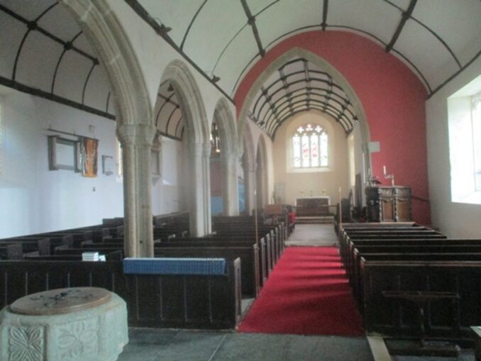 Soon after came the village of Langtree and the day’s first church visit. All Saints stood squarely on a hillside, a Perpendicular church of granite with the grey hues of flint. Inside were old stall pews through which a fine arcade of arches marched, under a white barrel-vault ceiling criss-crossed by black lines, creating a fishnet effect; a fine late 17th-century carved pulpit and an intriguingly off-centre chancel arch set in a red-painted dividing wall. Altogether an unusual and striking interior.