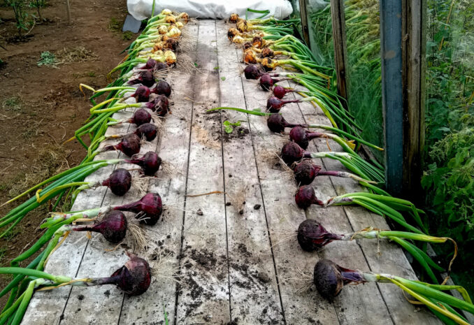 We decided, after consulting “The Smallholders Encyclopaedia”, to lift the onions and dry them out for a week or so on the longer greenhouse table. My loyal reader may remember that we planted thirty two each of red and white sets, so taking into account the eight I lifted in anticipation of the show, and given some of the atrocious weather we’ve had, a final haul of forty six very nice onions isn’t too shabby an outcome. We had contemplated tying them into strings (a la cour de la route Francais), but, being the rough and lazy gardener that I am, I think we’re going to buy half a dozen pairs of cheap tights and knot individual onions into the legs (in the manner of the lazy Englishman). You know it makes sense.