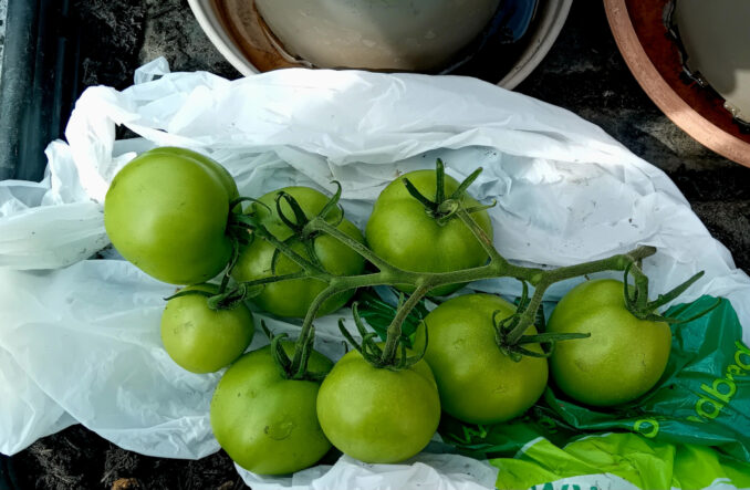 As much as I try to make sure this doesn’t happen, it happens. I tie trusses up to leaves, or sometimes manoeuvre a leaf into position underneath a truss to give it added support. I also, on occasion, cut back smaller fruits, to lessen the possibility of the weight of the fruits snapping or fully detaching the truss from the plant. Some plants manage the weight quite well, others don’t but I never get all the ones at risk until it’s too late (it can happen quite quickly). Any road up, I’m trying to ripen this bunch by keeping them in a paper sack accompanied by a banana skin. Some say it’s an old wives tail, we’ll see.