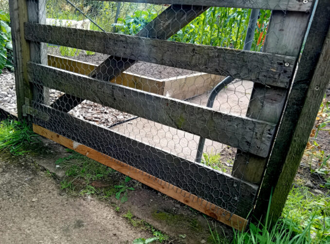 There are times (clearly) when I refuse to see the signs for what they are, although I’m happy with the first time outdoor carrot growing I was a bit nonplussed to find the tops of the unharvested ones had mysteriously disappeared, almost overnight. In my ignorance I put it down to butterflies, but a rustling in the rhubarb patch opened my eyes to the real culprit(s). We’ve seen a resurgence in the rabbit population this summer, it’s one of the reasons the gate was originally fitted with mesh. We’d (that’s the royal we) left a gap under the bottom rail to facilitate freedom of hose movement, too. The green plastic mesh and the narrow gap turned out to be no match for the teeth or the dexterity of a couple of infant rabbits, who decided the offer of young fresh carrot tops was too good to refuse. The B&M department leapt into action and performed the required upgrade with the minimum of fuss (apart from the odd chunter). Here’s hoping the little beggars can’t chew through chicken wire (or the new bottom rail).
