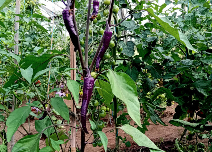 It’s odd to get excited about a simple little fruit, but when I first saw these Tyrian hued beauties I had to smile to myself at the simple beauty of both the tiny purple/white flowers and the seed pods they produce. I had planted at least half a dozen seeds of this variety, but only this one germinated. Apparently they’ll turn red, which is a bit of a shame, but for now they please me greatly.