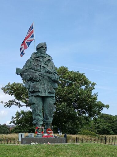 Modelled on a photograph taken by Royal Navy Commando Pete Holdgate, the statue is of a Royal Marine, ‘yomping’ with the weight of a full kit towards Port Stanley in May 1982, and the statue stands as a reminder of the human cost of The Falklands War. That Marine was a Swindon lad, Corporal Peter Robinson of 45 Commando.