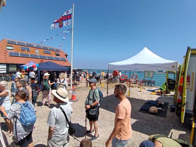 At the far end of the road, with Lock Lake on our left and the Langstone Channel on our right, is the diminutive foot passenger ferry to Hayling Island, which has been running across this narrow stretch of water with its treacherous tidal currents for some two-hundred years. This makes it a very sensible spot for a Lifeboat Station, and one (operated by the RNLI) has been here since 1965. Now, the RNLI aren’t really in my good books these days, though I was once a stalwart supporter. But it seems that many folk still are supporters, as today is their annual open day and it’s bustling. This was helped along by music from The Selsey Shantymen – great to hear, though we didn’t get off the bus.