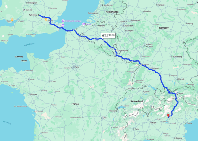 Aylesbury to Ashford Services. 1st refuel stop. Ashford to Folkestone Eurostar Terminal to pick up Le Shuttle to Calais. Calais to Luxembourg City via the E44; 2nd Refuel Stop and overnight hotel break. Then to Austrian Tyrol and 2nd overnight hotel break.
