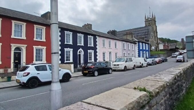 Aberaeron (Taffspeak: ‘mouth of the Aeron’) is a rather pretty Georgian seaside town (its development began around 1805) facing Cardigan Bay half-way between Cardigan and Aberystwyth and is known for the Regency style terraced houses being painted in bright colours.