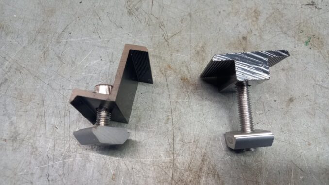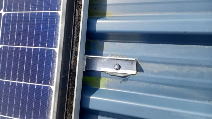 To mount the panels on my steel box section roof, I decided that I would use some aluminium angle sections bolted together to attach a dedicated bespoke mounting rail, an aluminium extrusion and then secure the panels with dedicated fasteners. The panels come with holes in their frame and it is possible to just fix the things with nuts and bolts, but I decided to spend a few quid and then everything should drop into place like Meccano and thus minimise the time spend on my hands and knees. It worked very well indeed and I was impressed with the result. The following pictures show the mounting system, and the various bits and bobs, a picture paints a thousand words and it really is child’s play. I got a free workout lifting the panels onto the roof and carting them about.