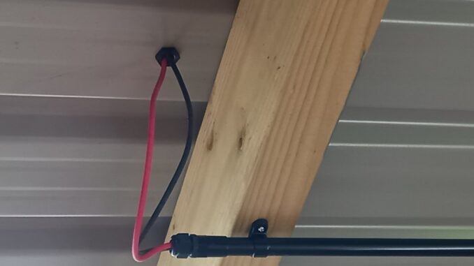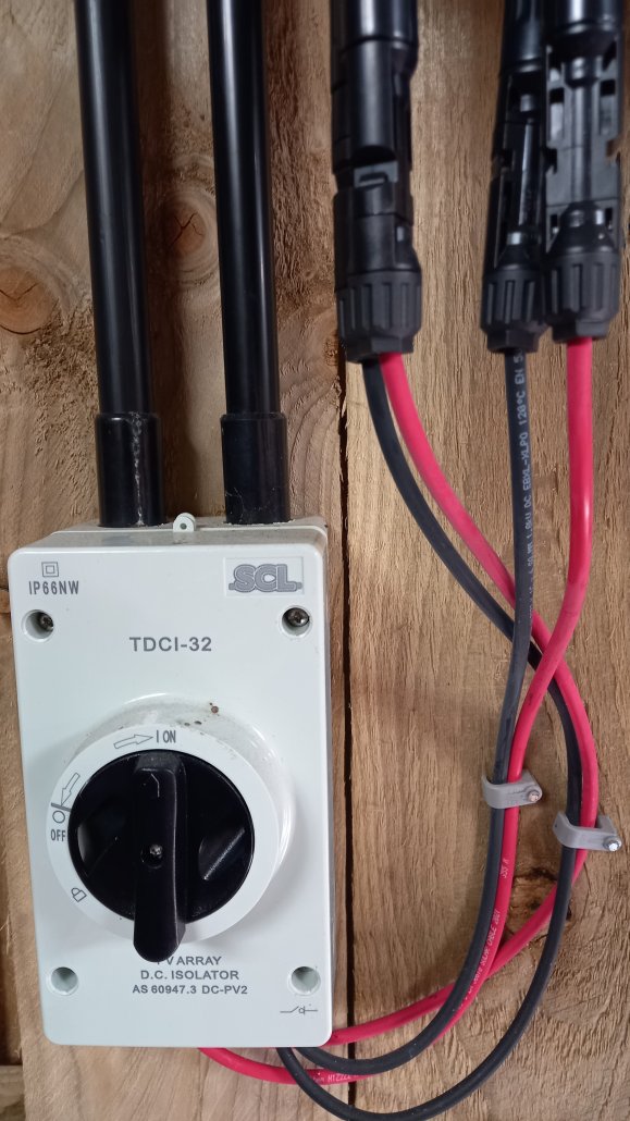 One has to take care with the DC system as a panel when exposed to light produces voltage which can’t be stopped. So you need to think out how you make the connections in advance, or do it in the dark or cover up the panels. PV panels in series easily make enough voltage to kill you, so this part demands respect. And I understand that the DC output is more dangerous than AC mains. Don’t let that put you off, driving a car is potentially deadly but if you remain alert and obey the rules you’ll probably survive. So I basically made all the connections inside the barn and finally connected the +ve and –ve to the pre-assembled string last.