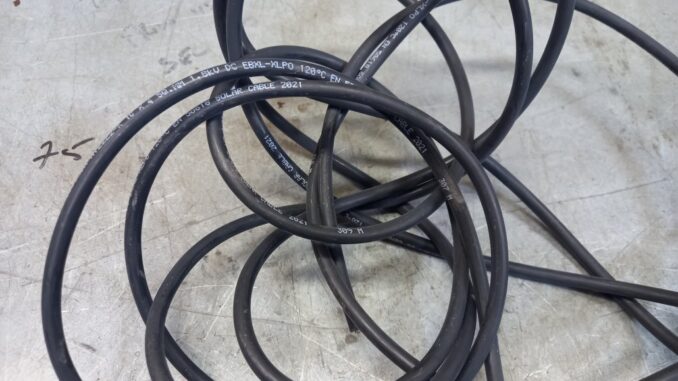 A note on PV panel connections: In rough terms the average solar panel produces around 35-50 volts DC and a maximum of 10 amps. Amps multiplied by volts gives power in Watts. Typically you join up a number of panels in series to form what they call a ‘string’ in the UK. If you parallel up a number of identical strings you get what they call an ‘array.’ So I joined my first 6 in series to provide a theoretical maximum output of about 220 Volts at 10 Amp, a total power of about 2.2kW. Connecting solar panels to the inverter should be done with specific specialist cable that can handle the high DC voltage and also survive sunlight and temperature extremes on the roof. It has thick insulation and a heavy copper cross section, accordingly it’s not particularly cheap.