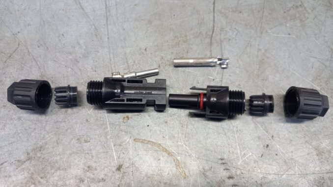 Solar PV cable is joined via MC4 cable connectors, These are basically inline connectors with a crimped joint for the cable termination and have waterproof glands for the cable entries and an O ring to seal the connection, they push together bayonet style and obviously come in male and female so you need to get your thinking cap on to make sure you couple +ve to –ve etc. It’s really very simple, especially for the panels as they come with the connections already fitted and so connecting them in series is foolproof. You can purchase an inexpensive crimping tool from ebay, or you could maybe solder but that was not tried, I preferred to stick with the design method.