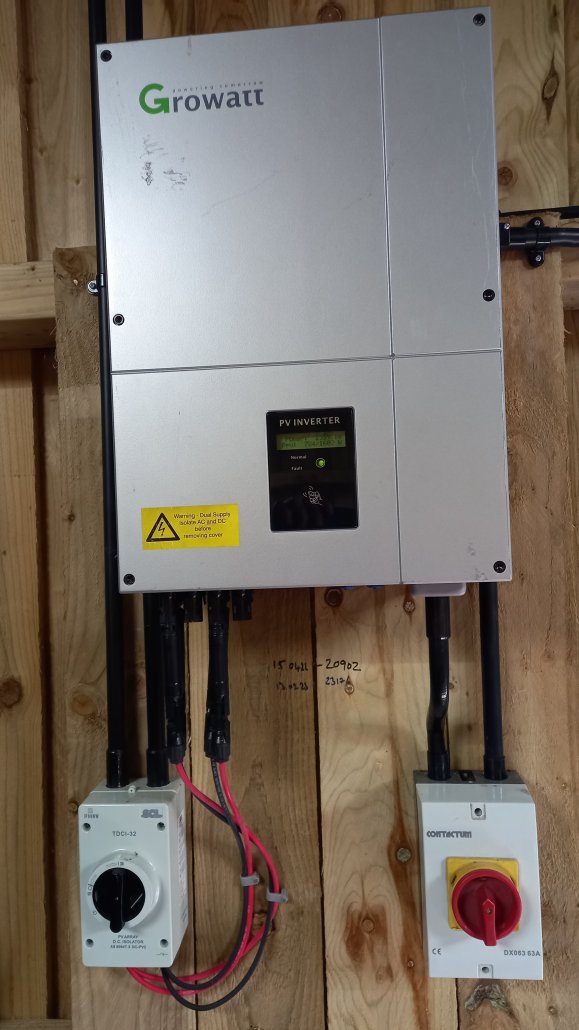 Inverters are an expensive component, but a perusal of ebay located a supplier than specialises in refurbished products at a decent price and I made an offer for £200 for an elderly Growatt 3600 unit. As its name suggests it can produce a maximum of 3.6kW and it has 2 MPPT’s or Max Power Point Trackers but more on that later. I particularly liked this unit as it weighed 20kg, much of which was a huge finned heat sink on the rear of the unit and it does not rely upon cooling fans like modern units. My experience of cooling fans on desk top PCs is that they clog the internals with dust and they need cleaning out every couple of years.