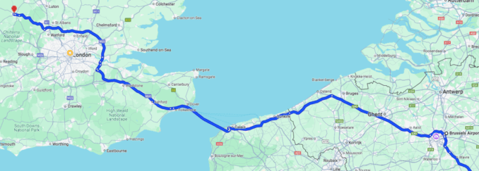After about 90 minutes after leaving Brussels, you’re starting to see overhead road signs on the A16 for Calais Tunnel Sous La Manche. Almost there.