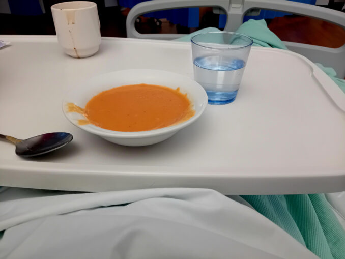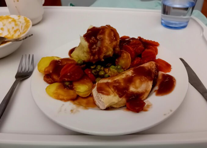 Up on the ward by 5pm and the first of my meals arrived. For those of you ensconced below the line that runs from south of the wash to the Bristol Channel, a bowl of lukewarm soup (edible enough) followed by a plateful of gravy smothered veg accompanying a piece of brick like chicken breast is just what Northern folk need to build them up following hip replacement surgery. I ate the soup, a bite of the chicken and some of the oven finished sliced potatoes, which were very nice. The apple sponge and custard, another northern classic, which followed went back to where it came from, less the apple, which I thought might make up for one of my five a day. My request for a glass of beetroot juice or a mug of nettle tea was met with blank stares and eye rolling. I remembered, as high as I still was (oramorph had been taken by this time) that my “self help” diet had me marked down, in NHS circles as “one of them”. The grapes, thoughtfully provided by my eldest daughter were very welcome. I was still numb from the waist down so the planned physio session was shelved for the day and I steeled myself for what I expected to be a night of pain, discomfort, opioid induced somnolence and urinating into cardboard bottles. I’d made myself a promise that, no matter what, a catheter wasn’t happening.
