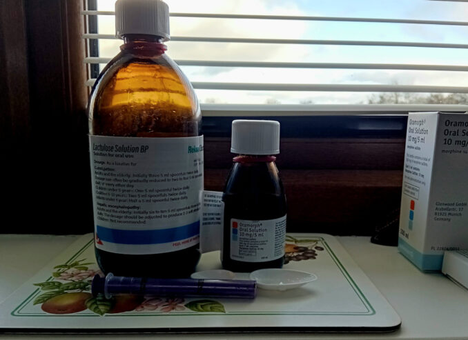 The big bottle of laxative and it’s smaller cousin, the Oramorph? Let’s just say that both were needed over the days following my discharge, the laxative a great deal more than the morphine. The relief, after six days of increasing discomfort was palpable, which is probably more information than needs to be imparted, but I’m glad that bit’s over and we can start moving forwards towards happier, less painful green-housing and, who knows, maybe even the odd fell walk or two.