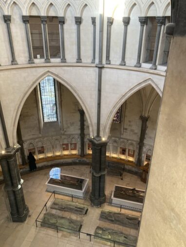 As well as the unique architecture and the Templar history it was a burial place of medieval knights. There are a 9 effigies of knights in the nave of the Church. These include William Marshall; his son, also William, and Brother Aymeric, Master of the Knights Templar. There is some nonsense in the book by Dan Brown, the ‘DaVinci Code’, about the knights that I know nothing about. Some of the film of the same name was made here.