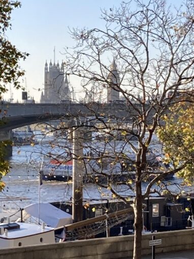 We approached from the West of London on a very bright, cold and crisp morning on the Tube. We managed to get lost and overshot due to not understanding that the Circle Line was not a Circle and we were, in fact, heading off to Hammersmith. Getting back on the right line we made our way to Temple station. We were by this time starving so, coming out of the station and bypassing the posh cafe and the Indian cafe, we stopped at a the Green Hut, a very nice cabin, serving hot sausage, bacon and egg rolls. This was very popular with the constant queue of building workers. There was a nice space, the Artist’s garden (ignoring the wank ‘modern art’ exhibition) with a great view of the river and Parliament, to eat our rolls.
