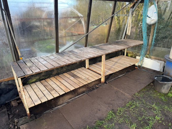 The buildings and maintenance department has been busy. We did lose some glass during the high winds in mid December, but I wasn’t able to offer my usual words of encouragement as they were replaced. In between times the potting table has been “shelved  out” and the timbers prepared for another two bays to be shored up where the angle iron base support has rusted away. It’s all go!