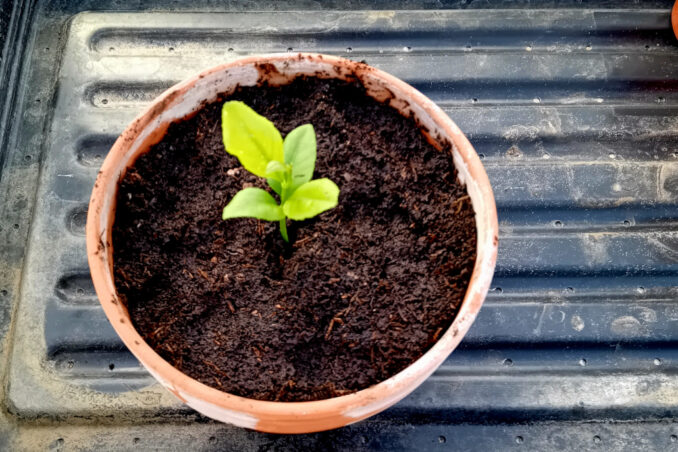 Apropos of nowt, really, beyond the fact that it managed to survive the winter without any care and attention at all (apart from the fact it happened to be on the potting table, under a leaky bit of roof and at least managed to get a drink). I’ve now potted this lemon tree seedling on in the hope that it may go on to produce fruit in the next couple of years. I know a man with a heated conservatory who owes me a favour or two, so if it does survive I’ll call on his good nature and see if, between us, we can’t get it through another winter and grow it on to maturity.